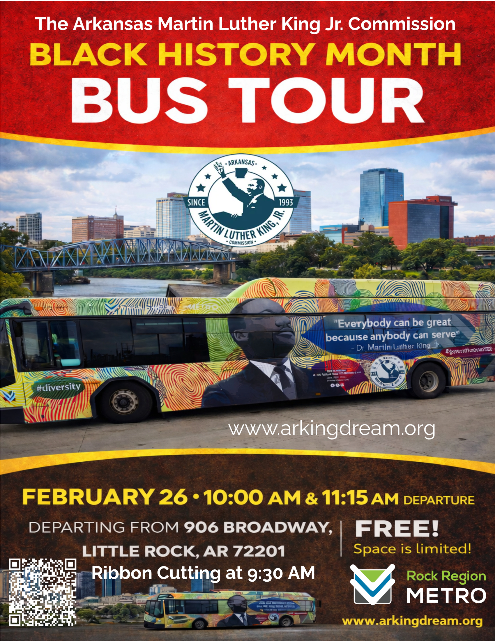 Little Rock, Arkansas – The Arkansas Martin Luther King, Jr. Commission, in partnership with Rock Region Metro, will host a Ribbon Cutting Ceremony at 9:30 AM on February 26, 2026, to officially unveil and launch the commemorative Rock Region King Bus.
