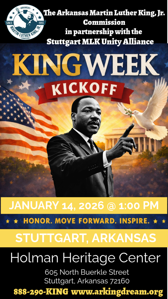 Join us as we celebrate the legacy of Dr. Martin Luther King, Jr. with the official King Week Kickoff in Stuttgart! Come together with community members, leaders, and neighbors to honor a vision of unity, service, and hope.