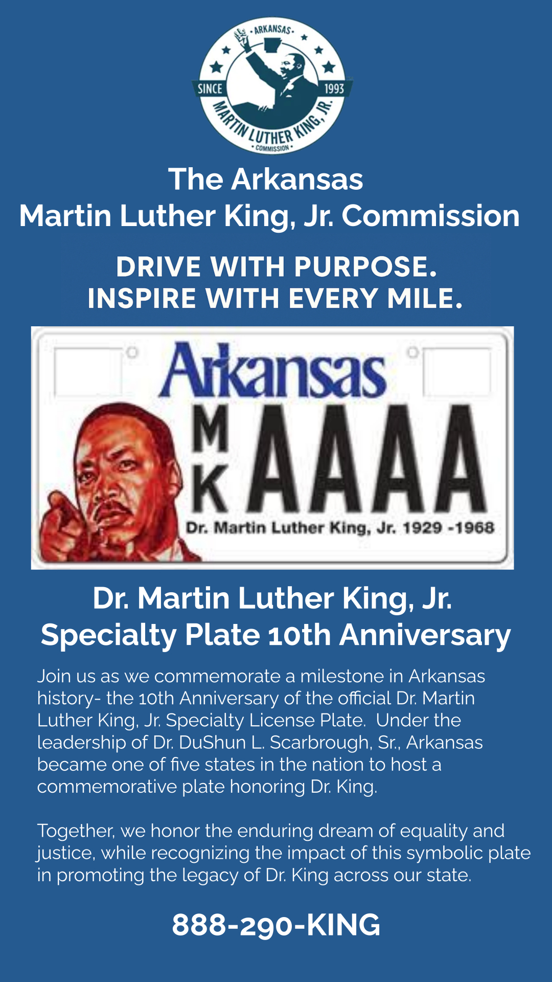 This year marks the 10th anniversary of the Dr. Martin Luther King, Jr. Commemorative License Plate in Arkansas — a powerful symbol of unity, equality, and service. For a decade, this license plate has served not just as a way to honor Dr. King’s legacy, but as a moving message of hope across every highway and byway of our great state. ![]()
